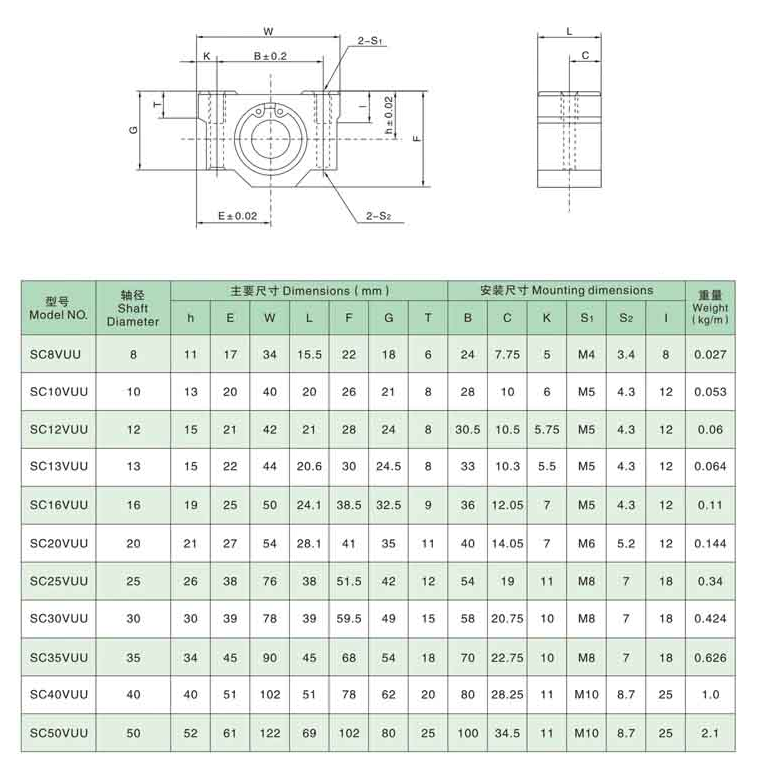 Mounted linear bearing, short block, 6mm to 30mm rod diameter, double sealed, SC6VUU, SC8VUU, SC10VUU, SC12VUU, SC16VUU, SC20VUU, SC25VUU, SC30VUU